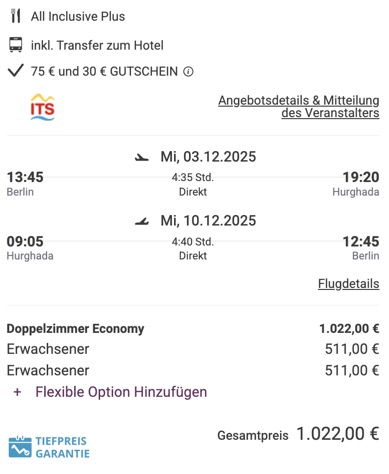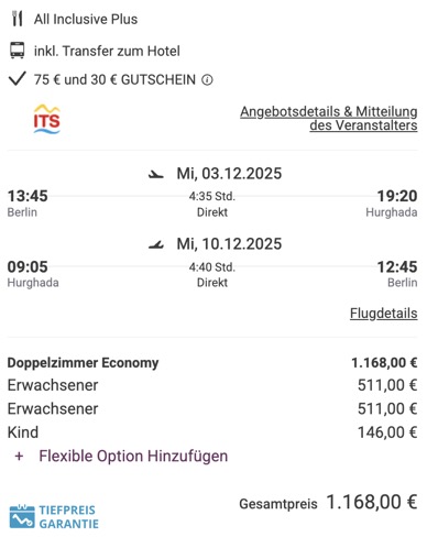 Alle hier genannten Reisepreise sind mit der Veröffentlichung des Deals verfügbar und buchbar, jedoch haben wir keinen Einfluss darauf, wann und wie stark sich ein Reisepreis verändern kann. Wenn die Nachfrage besonders hoch ist, kann der Flugpreis sich besonders schnell verändern und Unterkünfte ausgebucht werden.
