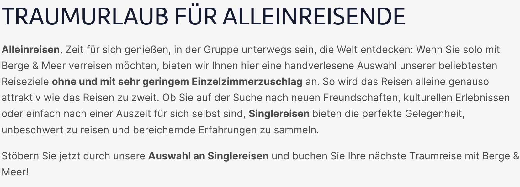Der Reiseveranstalter Berge & Meer bietet Alleinreisenden viele verschiedene Reisen weltweit mit geringen oder teilweise keinen Einzelzimmer-Aufschlägen an und das Beste: Das Angebote ist so groß und wechselt so regelmäßig, dass garantiert auch was für dich dabei ist! 🥳