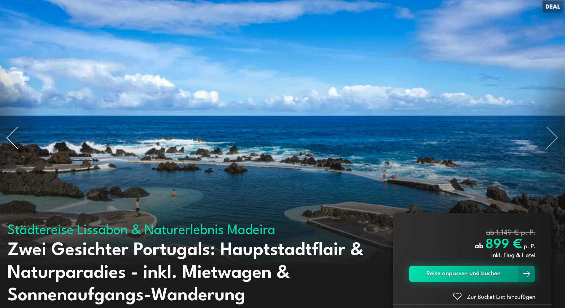 Diesen Deal gibt es mit 7, 9, 11 und 14 Nächten Aufenthalt - inklusive Direktflügen (Hinflug nach Lissabon; Rückflug von Funchal), Flüge von Lissabon nach Madeira, Mietwagen auf Madeira, 24h Citypass für Lissabon (gratis öffentlicher Nahverkehr) + Wanderung zum Sonnenaufgang zur Sankt-Lorenz-Spitze & Hotels (inklusive Frühstück) bereits ab 869 Euro pro Person 🇵🇹!