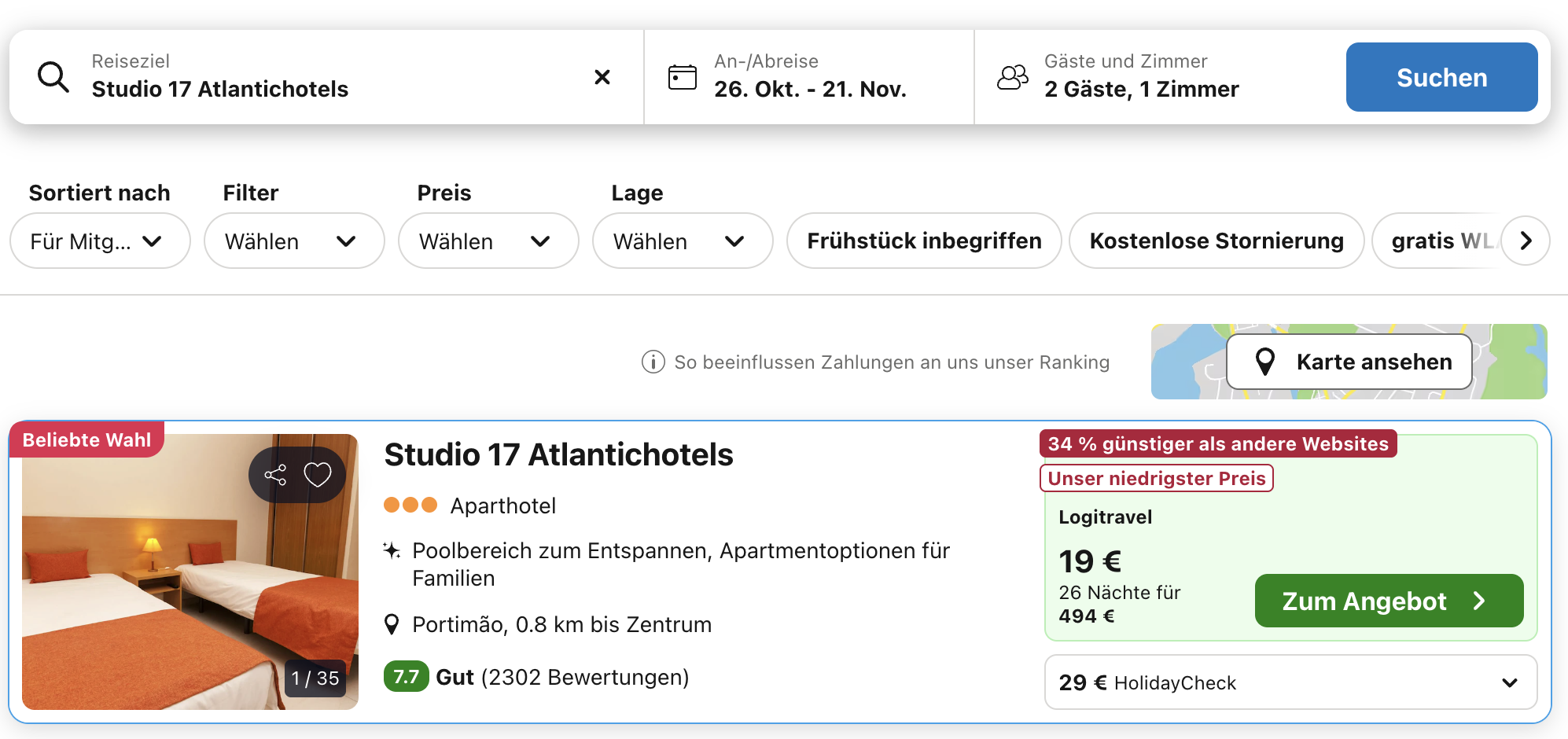 Ich habe euch günstige Flüge im Oktober rausgesucht und kombiniert mit einem Studio in Portimão, ca. 20 Minuten zu Fuß vom wunderschönen Strand Praia da Rocha. Das Studio kostet bei längeren Aufenthalten gerade mal 9,5€ pro Person/Nacht!😱 Es ist ausgestattet mit Küchenzeile, Essbereich und Bad. Das größere Apartment (50 qm + separates Wohnzimmer) kostet nur 2€ pro Nacht Aufpreis!🔥 Damit zahlt ihr für 26 Übernachtungen + Flügen nur krasse 320€! Die Lage ist perfekt, um die gesamte Algarve in beide Richtungen zu erkunden!😍