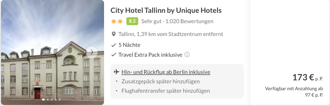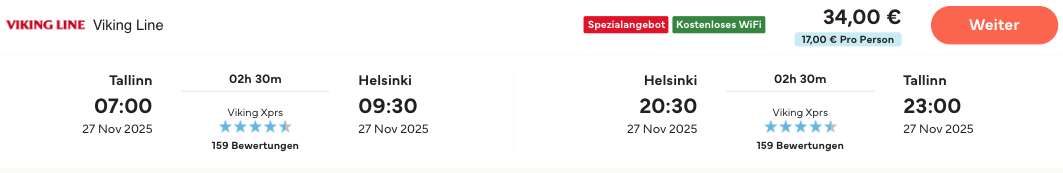 ℹ️ Dieser Deal besteht aus mind. 2 Buchungsleistungen: einmal die Pauschalreise mit Flug & Hotel in Tallinn, und einmal die separate Fährbuchung für den Ausflug nach Helsinki