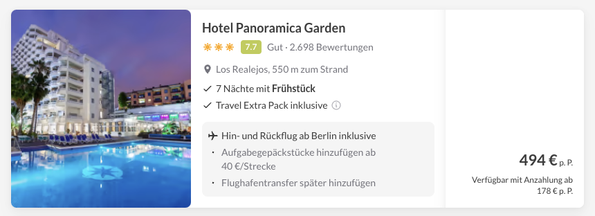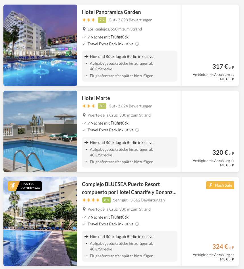 Wir haben in unserem Beispiel Flüge ab Berlin-Brandenburg inkl. 1x Gepäck, 7x Übernachtungen in einem schönen Hotel in Puerto de la Cruz (mit Pool & Frühstück) sowie das Busticket eingerechnet und kommen auf einen starken Eckpreis von 387 Euro pro Person. 👉 Für Alleinreisende haben wir ebenfalls ein Angebot eingebaut. 🔥