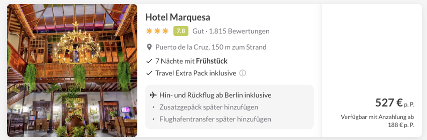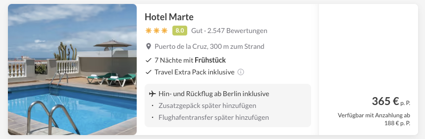 Wir haben in unserem Beispiel Flüge ab Berlin-Brandenburg inkl. 1x Gepäck, 7x Übernachtungen in einem schönen Hotel in Puerto de la Cruz (mit Pool & Frühstück) sowie das Busticket eingerechnet und kommen auf einen starken Eckpreis von 419 Euro pro Person. 👉 Für Alleinreisende haben wir ebenfalls ein Angebot eingebaut. 🔥