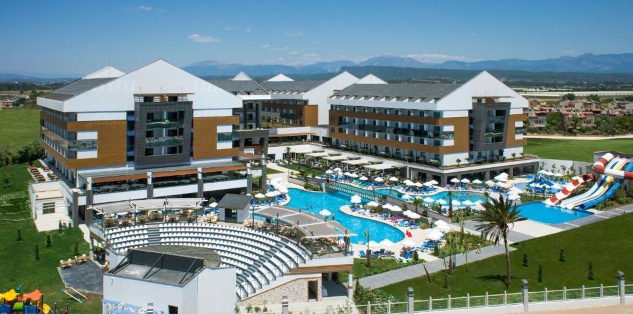 Das 5* Resort liegt etwa 50km entfernt vom Flughafen Antalya, bis zum hoteleigenen Strand sind's 600 Meter. Außerdem gibt's eine großzügige Poollandschaft und für Kids sogar 3 Wasserrutschen.