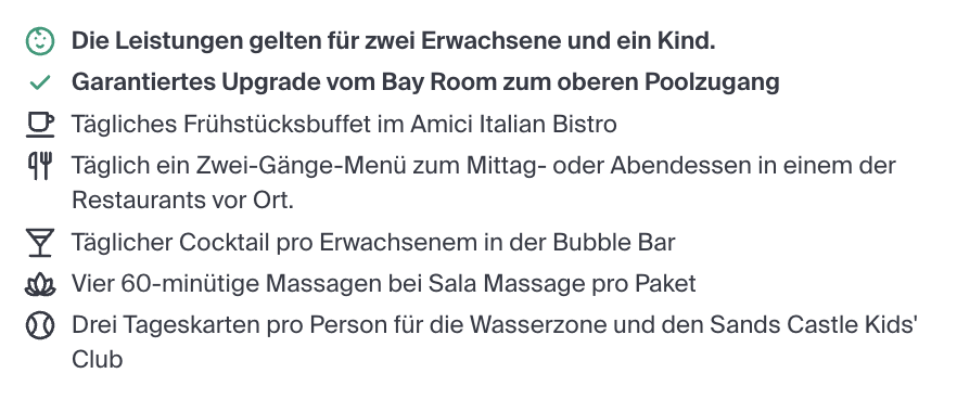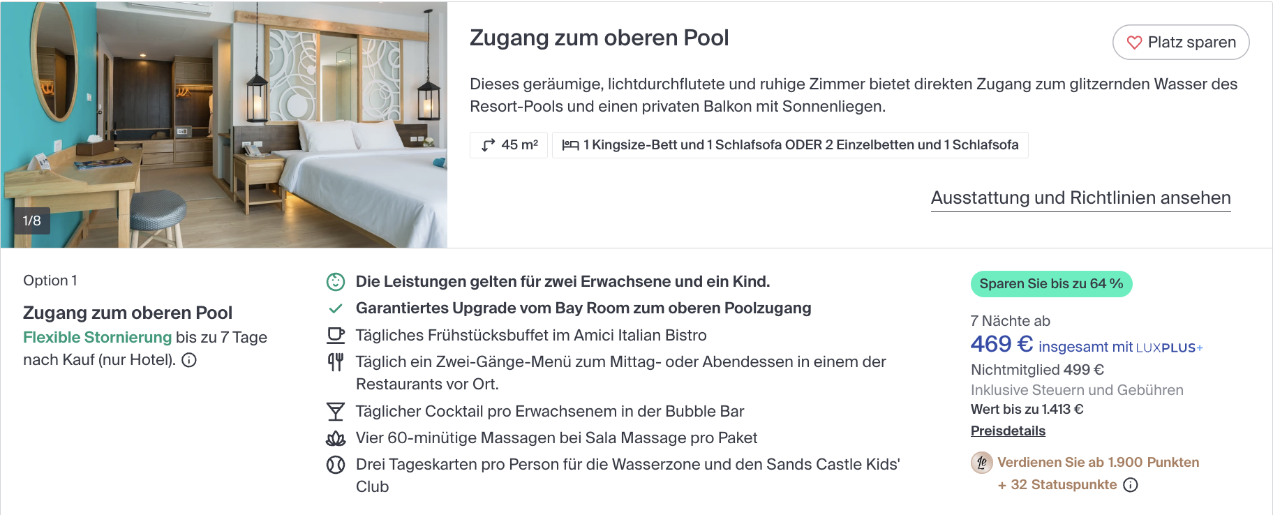 Dieses Angebot ist damit so schon insgesamt über 235€ günstiger - rechnet man noch die täglichen Cocktails, die 4x 60-minütigen Massagen hinzu, wird die Ersparnis deutlich höher. Zudem ist in unserem Angebot auch bereits 1 Kind inkludiert. Für 2 Erwachsene + 1 Kind haben wir das günstigste Angebot ab 961€ gefunden, somit erhöht sich die Ersparnis nochmal auf insgesamt 462€.