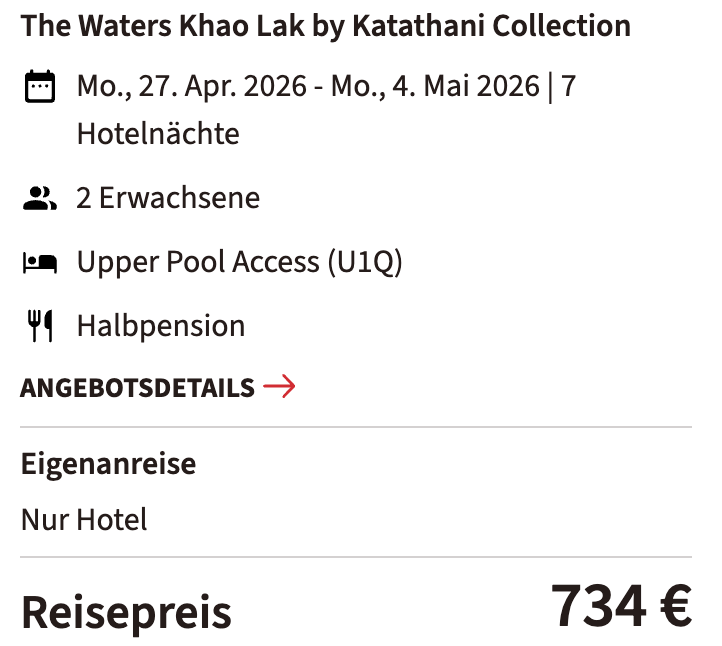 Auf gängigen Buchungsplattformen zahlt man, beispielsweise vom 27. April bis 04. Mai 2026, für die gleichen o.g. Grundleistungen (Frühstück + Mittag- oder Abendessen) satte 734 Euro bzw. 367€ pro Person.