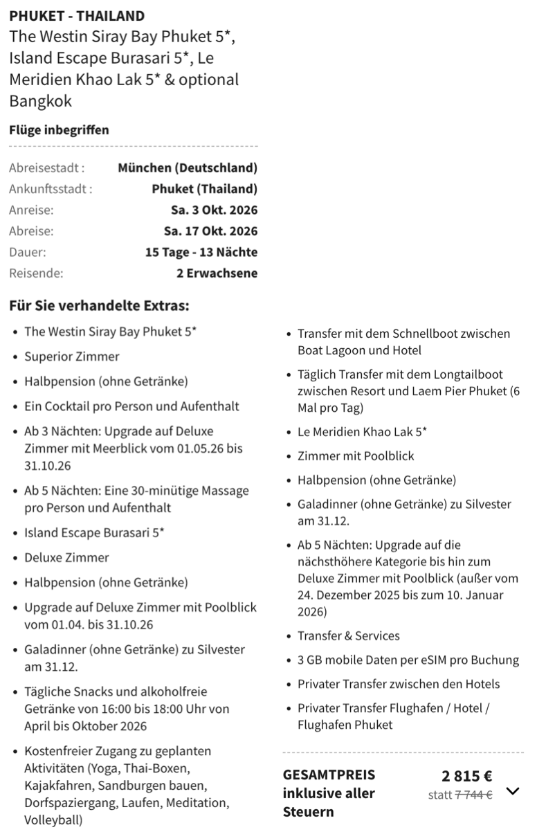 Ein neuer Premium-Thailand-Deal in genau dem Stil, den ihr liebt: drei luxuriöse 5-Sterne-Resorts, drei völlig unterschiedliche Vibes und zwei volle Wochen pure Fernreise-Magie – komplett stressfrei dank Flügen, allen Transfers & Halbpension ab 1.408 € pro Person.