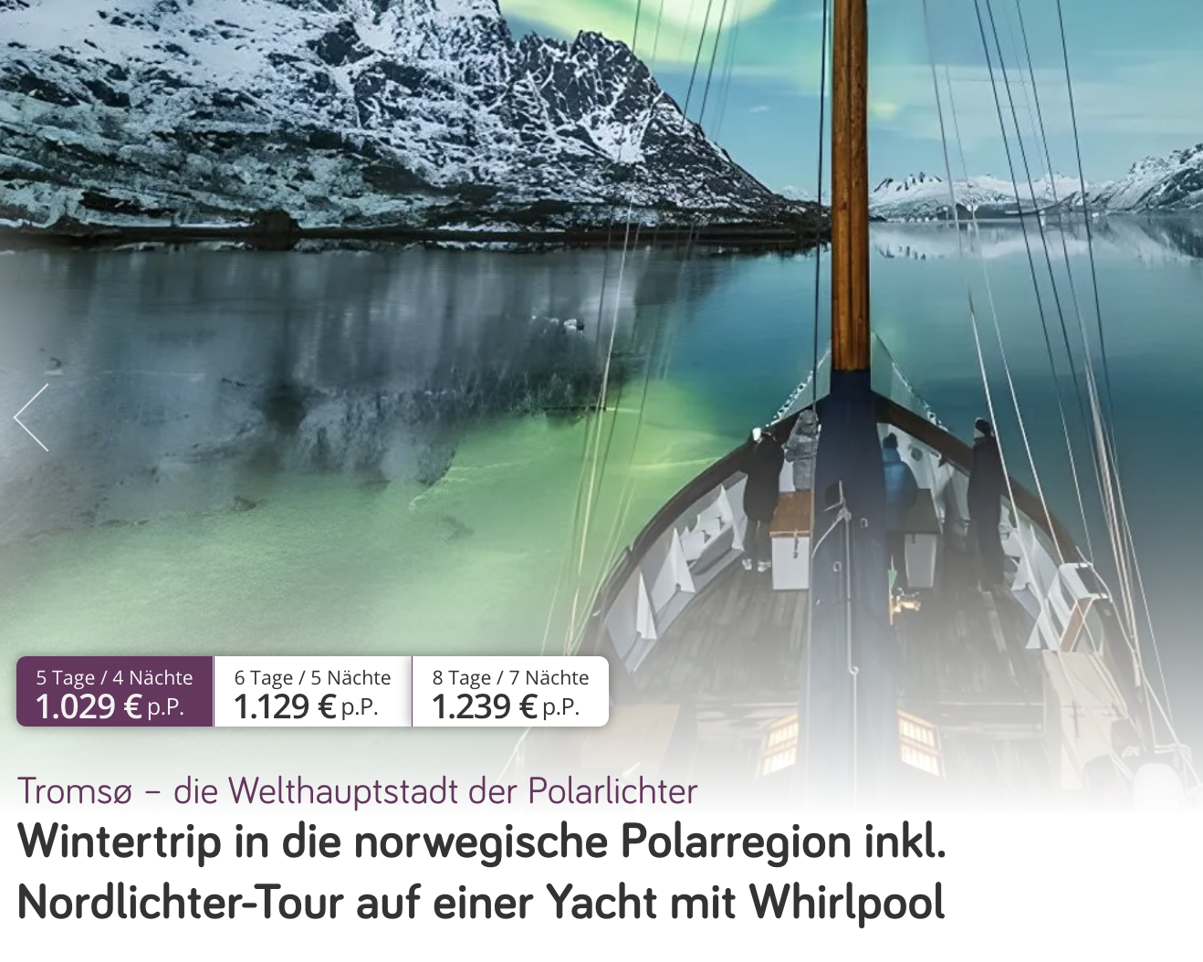 Die Aufregung steigt, sowohl auf eurer Seite, nachdem ihr diesen Deal gesehen und euch zum Buchen entschieden haben werdet, aber auch auf meiner Seite, denn im Dezember werde ich ebenfalls auf Polarlichter-Jagd in Tromsø gehen und kann es, bei den atemberaubenden Bildern, kaum erwarten! 🤩 🇳🇴