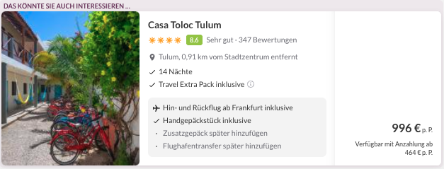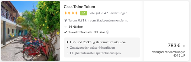 Mit diesem unschlagbaren Angebot geht es z.B. im Februar für 2 Wochen nach Tulum 🤩. Ihr fliegt mit Air Canada von Frankfurt am Main. Es gibt viele unterschiedliche Unterkünfte für jedes Budget, so z.B. das Casa Toloc Tulum mit guten Bewertungen.