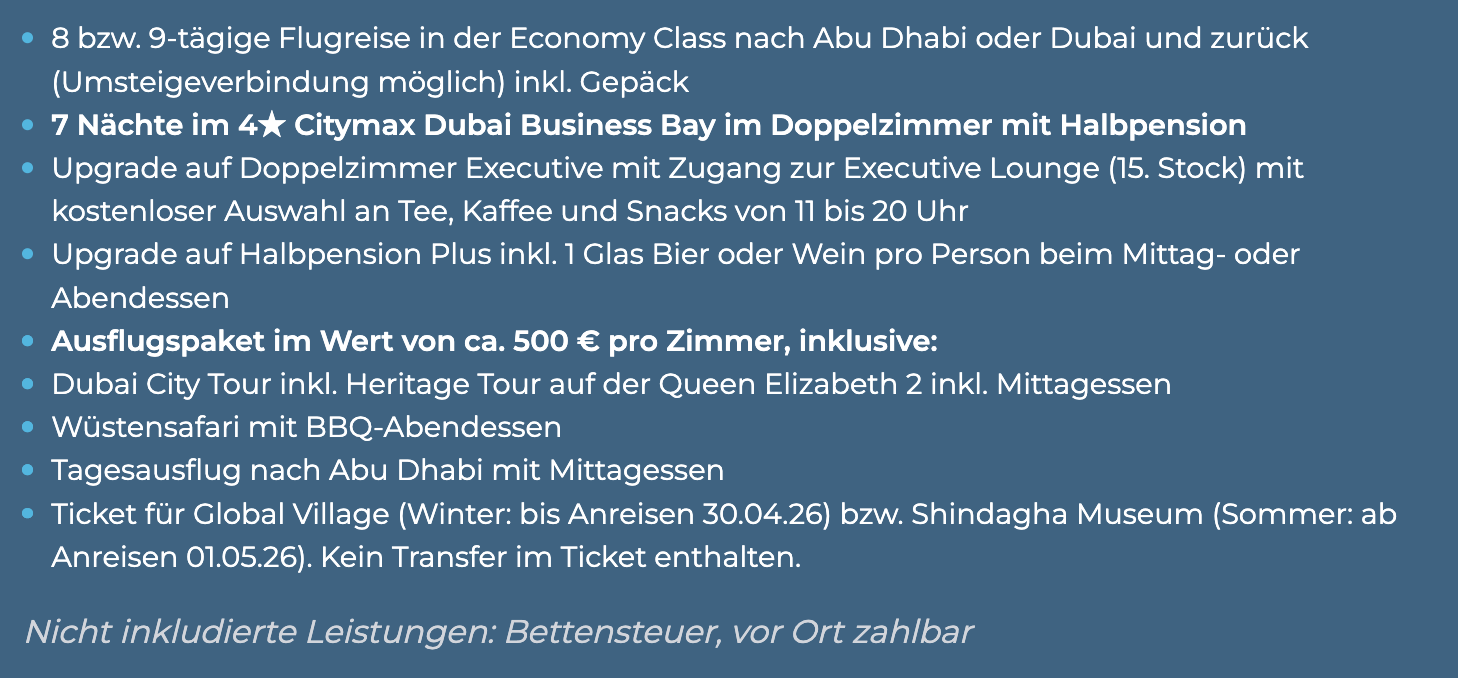 7 Nächte im stylischen 4* Citymax Dubai in der Business Bay. Perfekte Lage, Upgrade aufs Executive-Zimmer, Halbpension Plus und Lounge-Zugang 😍. Doch das ist nur der Anfang: Eine Wüstensafari mit BBQ, eine Citytour durch Dubai, ein Tagesausflug nach Abu Dhabi und der Besuch des Global Village (oder alternativ des Shindagha Museums) sind schon inklusive und das alles ab unglaublichen 699€ pro Person! 😱