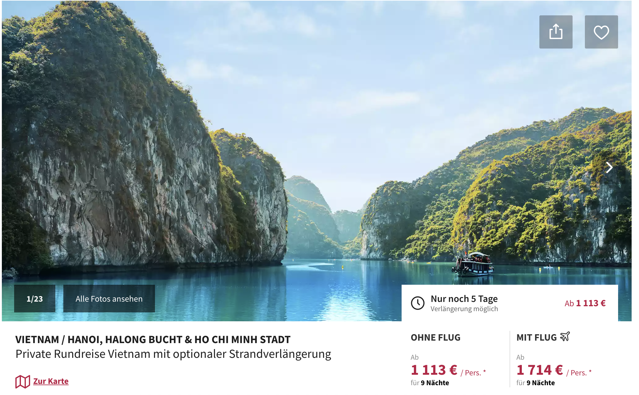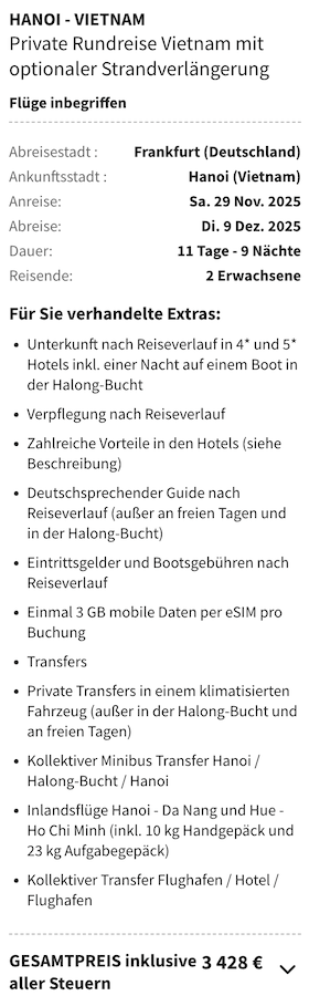 Bereit für das Abenteuer eures Lebens? Diese private Vietnam-Rundreise führt euch in 10 Tagen durch die faszinierendsten Orte des Landes – von der historischen Hauptstadt Hanoi bis ins pulsierende Ho-Chi-Minh-Stadt. Und das mit allem Komfort: 4- und 5-Sterne-Hotels, Inlandsflüge, Transfers, deutschsprachiger Guide und sogar eine Nacht an Bord eines traditionellen Bootes in der atemberaubenden Halong-Bucht. 🚤✨