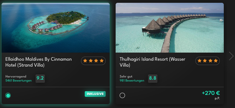 Im Buchungsprozess kannst du neben Ausflügen auch aus verschiedenen Hotels wählen. Auf den Malediven stehen euch beispielsweise 4- und 5-Sterne sowie verschiedene Zimmerkategorien zur Verfügung. So könnt ihr beispielsweise ab 270 Euro pro Person von einer Strandvilla auf eine Wasservilla upgraden.