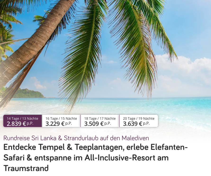 🫶 Die ganze Reise gibt es inklusive der Flüge mit Aufgabegepäck, Übernachtungen, Halbpension in Sri Lanka und All Inclusive auf den Malediven, Zugticket, Transfers & Eintrittsgelder laut Reiseplan ab 2.789 Euro pro Person.