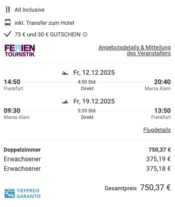 Alle hier genannten Reisepreise sind mit der Veröffentlichung des Deals verfügbar und buchbar, jedoch haben wir keinen Einfluss darauf, wann und wie stark sich ein Reisepreis verändern kann. Wenn die Nachfrage besonders hoch ist, kann der Flugpreis sich besonders schnell verändern und Unterkünfte ausgebucht werden.