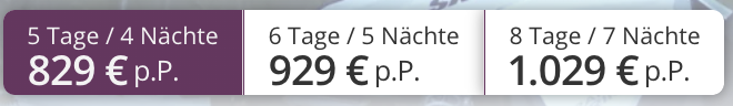 💤 Du kannst diese Reise in verschiedenen Längen buchen, und zwar mit 4, 5 oder 7 Nächten Aufenthalt.