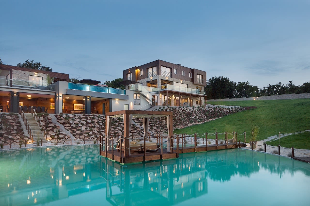 Das Highlight sind aber die drei privaten Pools! Der größte ist wie ein See angelegt, mit einem Gartenpavillon in der Mitte. Darüber befindet sich der beheizbare Infinity-Pool, welcher von einer großen Terrasse umgeben ist. Der dritte Pool befindet sich im Inneren der Villa und bietet außerdem einen Jacuzzi. Hier findet ihr auch eine Finnische Sauna und ein Hamam.