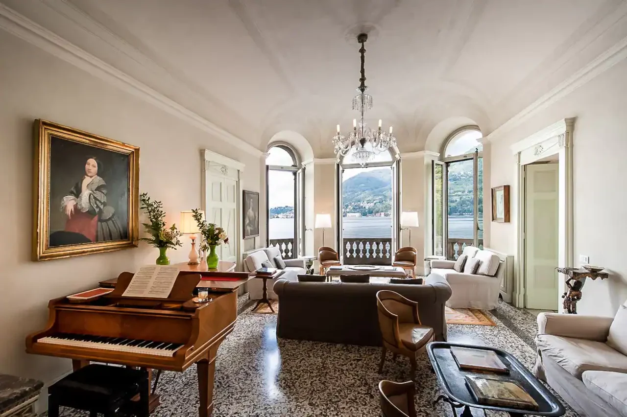 Das Innere der Villa ist eine Mischung aus alt und neu. Es gibt mehrere Wohnzimmer, darunter eines mit einem beeindruckenden Triptychon aus Glastüren und einem Balkon mit Blick auf den See. Hier steht sogar ein historisches Steinway-Klavier! Ein weiteres Wohnzimmer verfügt über einen Kamin.
