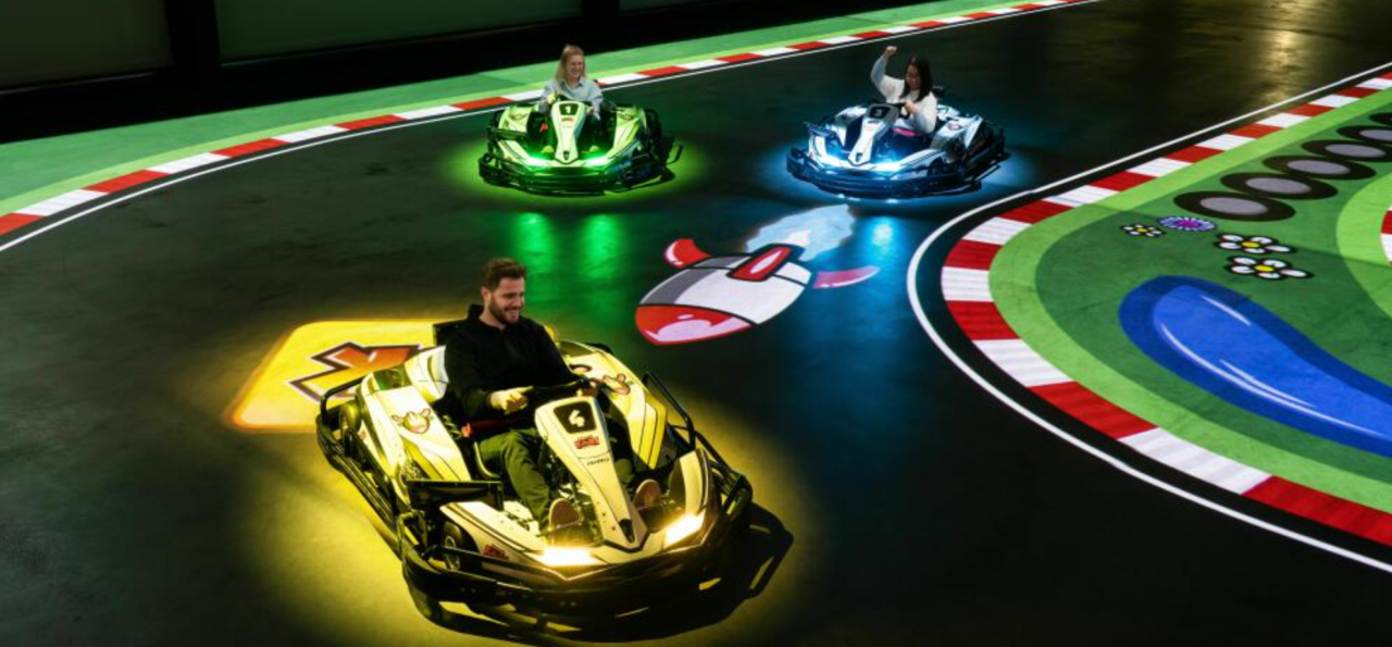 MarioKart® im realen Leben! Wer schon immer davon geträumt hat, sollte zum BattleKart nach Bispingen. Auf 2.000qm projizieren mehr als 30 Beamer die Welt von MarioKart® auf die Fahrbahn. Ihr steigt für den Spaß in eines der E-Karts und habt die Wahl, ob ihr im Team oder jeder gegen jeden spielt.