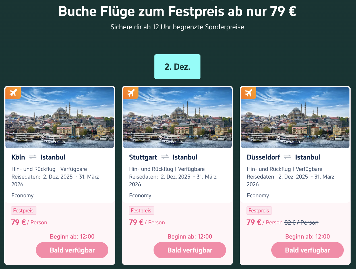Trip.com kommt mit einem weiteren Deal zum Travel Tuesday um die Ecke: Einem 24-Stunden-Sale auf Kurzstreckenflüge. Darunter Return-Flüge ab 79€ Return Istanbul. Weitere günstige Strecken führen nach Spanien, Frankreich, Italien, Großbritannien und Portugal!