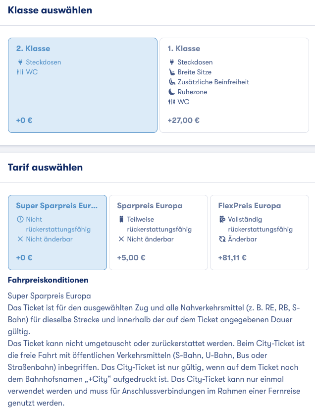 Gegen einen Aufpreis könnt ihr auch die 1. Klasse sowie den Sparpreis Europa wählen, wenn ihr flexibel bleiben wollt:
