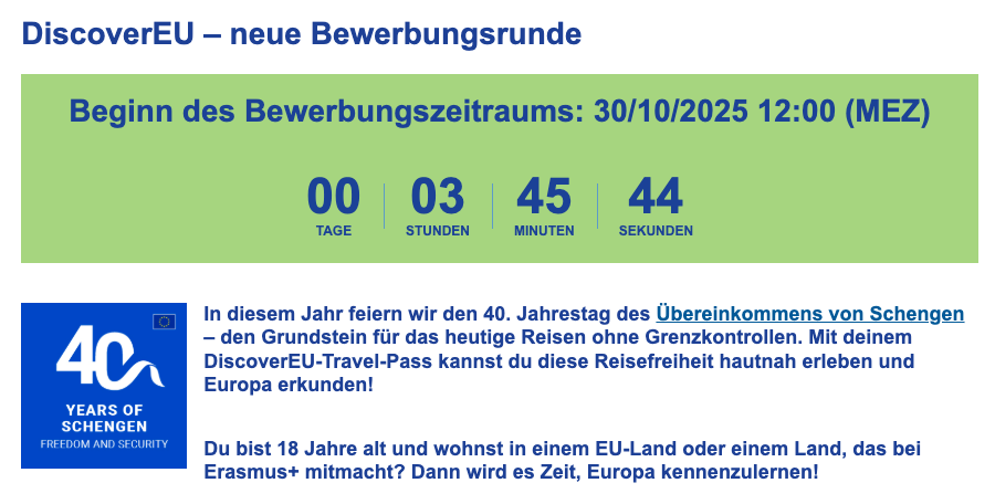 Bis 13. November um 12 Uhr könnt ihr euch für die Aktion bewerben. Alles, was ihr zur #DiscoverEU-Aktion wissen müsst, haben wir euch hier zusammengefasst.