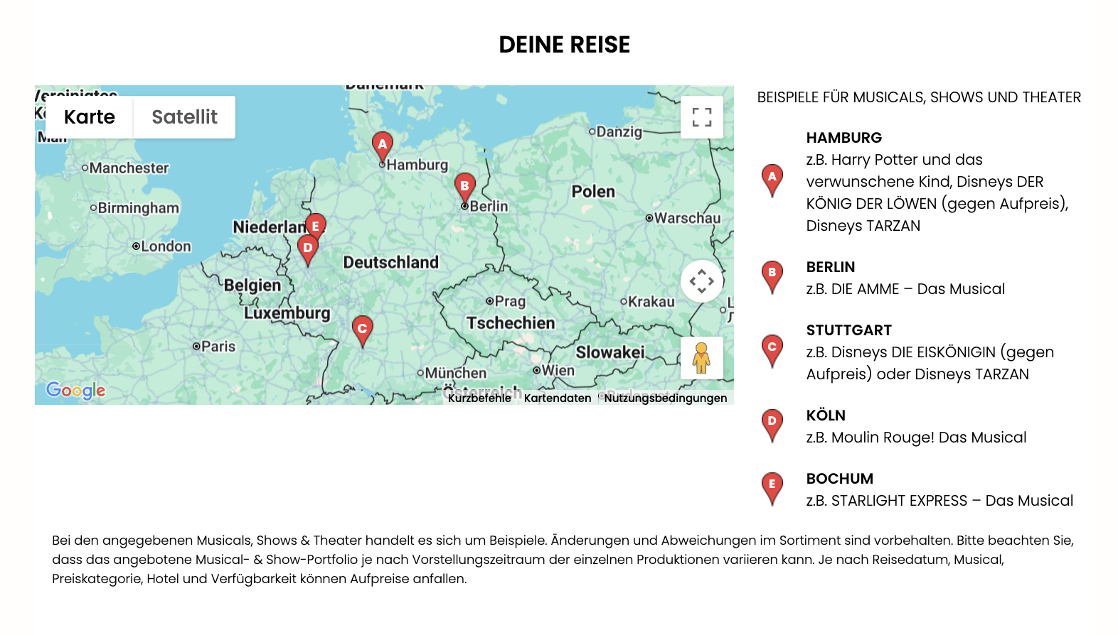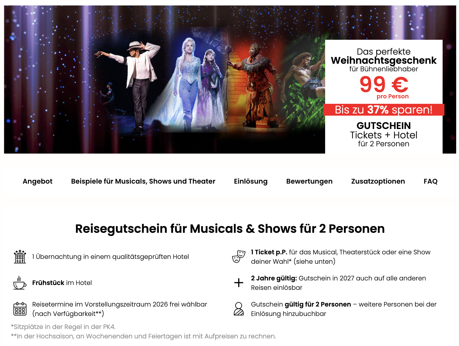 Bei Travelcircus gibt's einen wirklich coolen Deal für euch: Einen Gutschein für ein Ticket + Hotelübernachtung ab NUR 99€ pro Person (Gesamtpreis 198€). Besonders cool ist hierbei, dass ihr aus zahlreichen Musicals und Shows wählen könnt. Dabei habt ihr zum Beispiel die Wahl zwischen Disneys DIE EISKÖNIGIN, Harry Potter und das verwunschene Kind, Disneys DER KÖNIG DER LÖWEN und noch mehr.