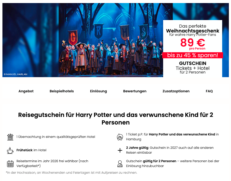 Aktuell bekommt ihr einen Reisegutschein für Tickets für Harry Potter und das verwunschene Kind in Hamburg inkl. Hotelübernachtung für nur 89€ pro Person (178€ Gesamtpreis).