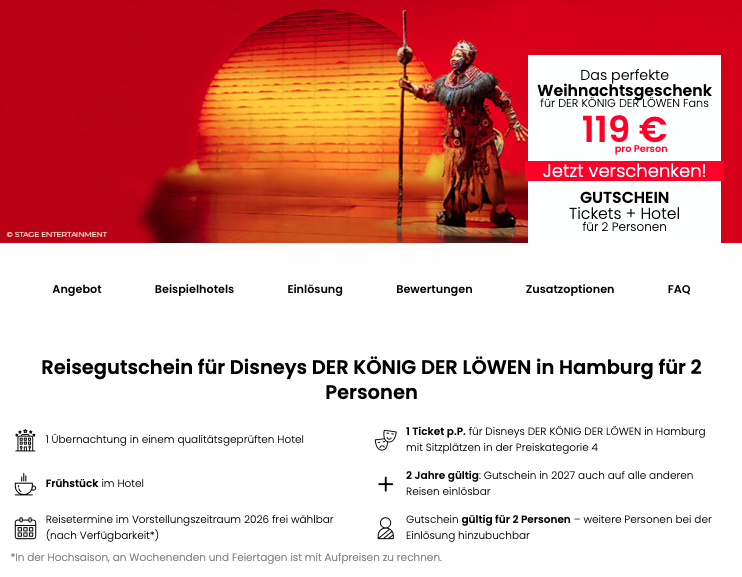 Der Vorteil des Gutscheines: Man muss sich nicht sofort festlegen, wann der Besuch von Disneys DER KÖNIG DER LÖWEN erfolgen soll, der Gutschein ist für den gesamten Vorstellungszeitraum 2026 gültig. Und was, wenn es dann 2026 doch nicht passt? Kein Problem, denn der Gutschein wandelt sich 2027 in einen Travelcircus-Wertgutschein um, der dann auf alle Reisen einlösbar ist.