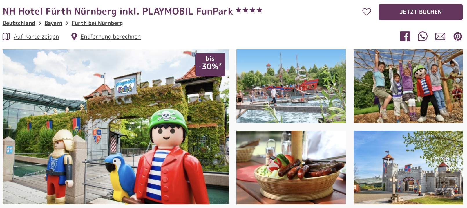 Das NH Hotel Fürth Nürnberg liegt in der Nähe vom Fürther Hauptbahnhof. Übernachtet wird bei diesem Angebot in der 40qm großen Familysuite, die Platz für 2 Erwachsene und bis zu 2 Kinder bietet. Der Playmobil FunPark ist ca. 10km entfernt.
