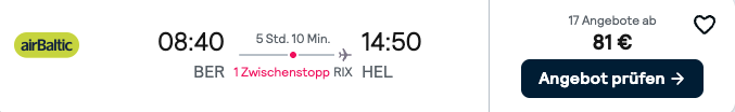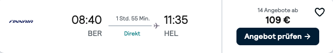 heute haben wir einen ganz besonderen Deal für euch. Es geht nämlich mit dem Santa Claus Express 🎅 von Helsinki nach Rovaniemi ins Weihnachtsmanndorf bzw. an den Polarkreis ❄️. Ihr fahrt also einmal quer mit dem Zug durch ganz Finnland 🇫🇮. Das ganze haben wir mit günstigen Flügen von Berlin nach Helsinki und zurück von Rovaniemi kombiniert. Ebenfalls inklusive sind 2 Nächte in Helsinki und Rovaniemi.