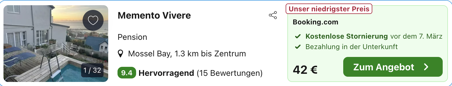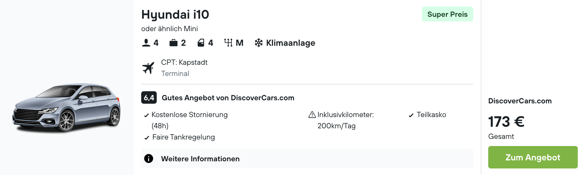 In Kapstadt haben wir ein ein gut bewertetes Aparthotel im CBD (Stadtzentrum) herausgesucht. Von dort aus seid ihr innerhalb von ca. 6 bis 10 Fahrminuten an der V&A Waterfront und in ca. 15 Minuten an der Talstation vom Tafelberg. Lasst für Unternehmungen in der Stadt das Auto am besten stehen und ruft euch einen Uber.