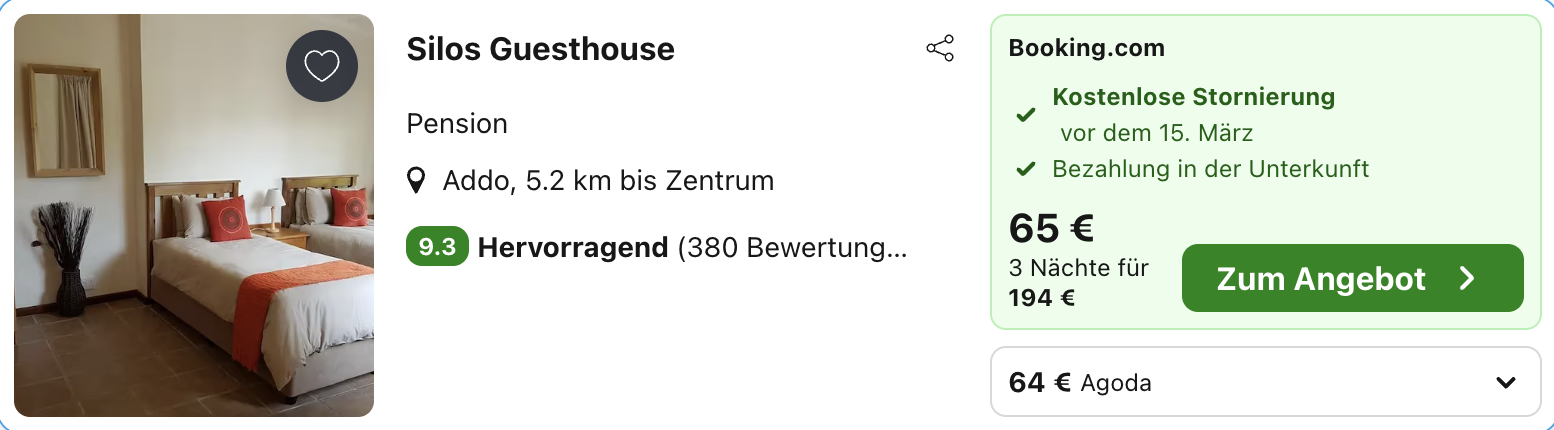 Rund eine Stunde entfernt von Gqeberha (ehemals Port Elizabeth) könnt ihr im Addo Elephant National Park auf Safari gehe. Im Park selbst gibt es zwei luxuriöse Lodges und mehrere Camps, bei dem ihr in von SAN Parks betriebenen Häusern und Hütten übernachten könnt. Alternativ findet ihr vor den Toren verschiedene Unterkünfte, wie das Silos Guesthouse.