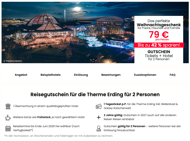 Den Reisetermin könnt ihr (oder die Beschenkten) ab sofort bis Ende Juni 2026 frei auswählen (nach Verfügbarkeit). Während des Einlösungsprozesses könnt ihr (teilweise gegen Aufpreis) aus verschiedenen Hotels wählen, weitere Personen hinzufügen und den Thermen-Aufenthalt upgraden. In der Hochsaison, an Wochenenden und Feiertagen ist mit Aufpreisen zu rechnen.